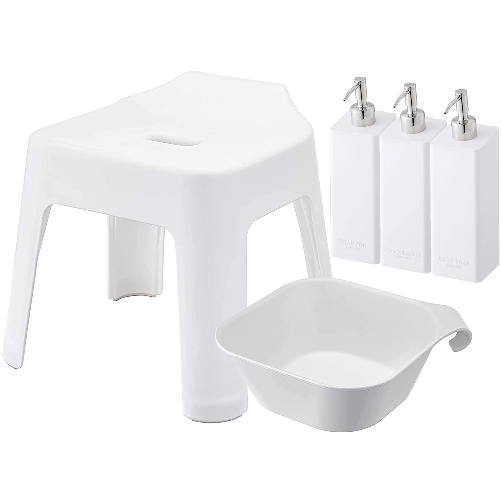 山崎実業(Yamazaki) 引っ掛け風呂イス 座面高30cm + マグネット&引っ掛け湯おけ + マグネットディスペンサーボトル 3本セット 【5点セット】 tower バスチェア ホワイト 5526 5378 4258 4260 4262