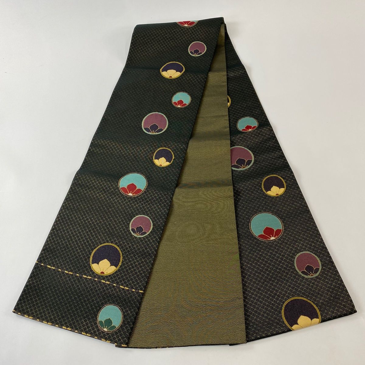 袋帯 秀品 関西仕立て 丸紋 花 金糸 墨色 六通 正絹