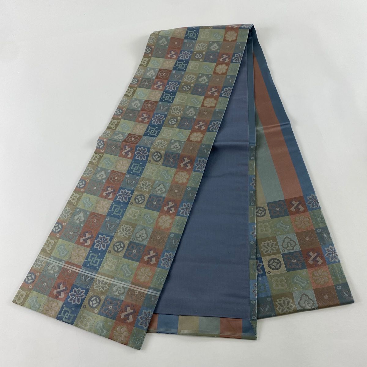 開き名古屋帯 宝尽くし 花 灰緑 正絹