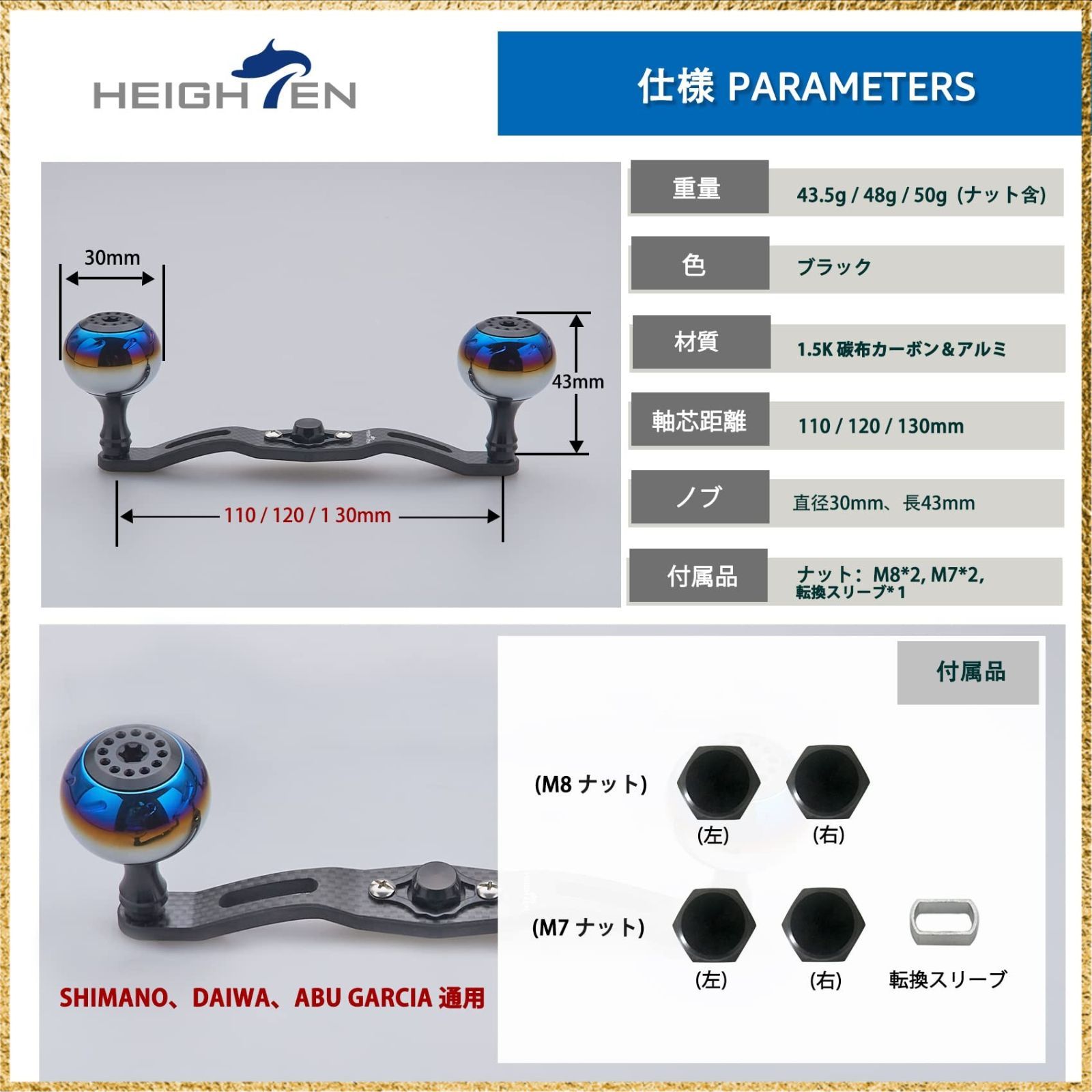 ☆彡送料無料でお届け☆彡Size:120mm_Color:ブラック HEIGHTEN 130/120/110mm リール ハンドル 厚さ4mm 1.5K炭布 カーボン 30mmノブ搭載 シマノ(SHIMANO) ダイワ(DAIWA) アブ(Abu) 通用 ベイトリール 用 Aurora Series (120mm, ブラック) (358)