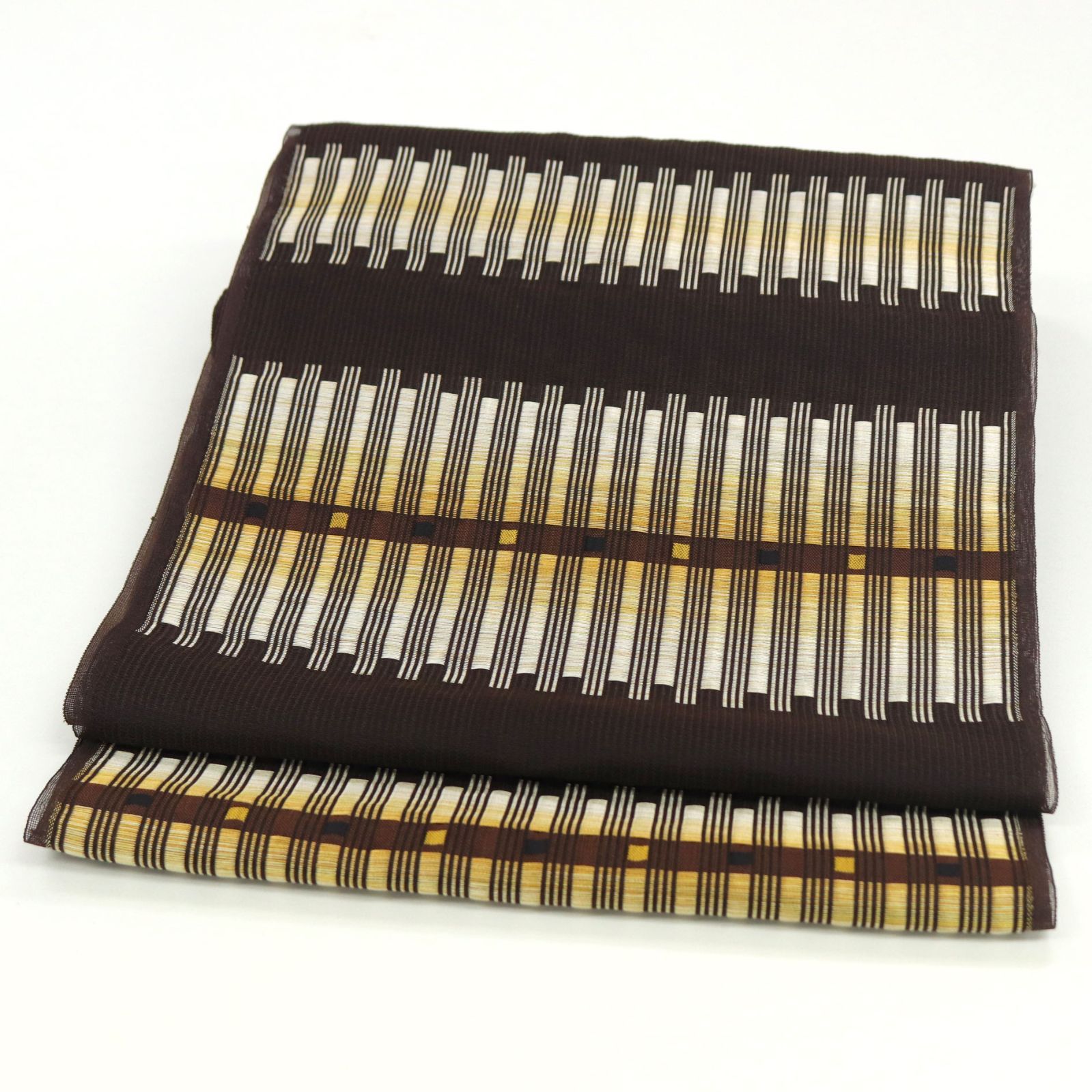 少し透け感のある帯地は、焦げ茶色のお色目でございます。帯地には縞の地紋が施されております。