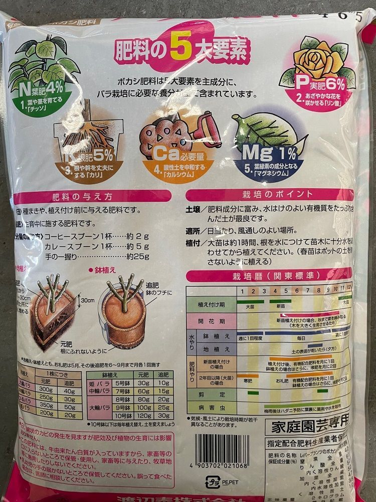 肥料の5大要素(N P K Ca Mg)を主成分に、バラ栽培に必要な養分がすべて含まれています。