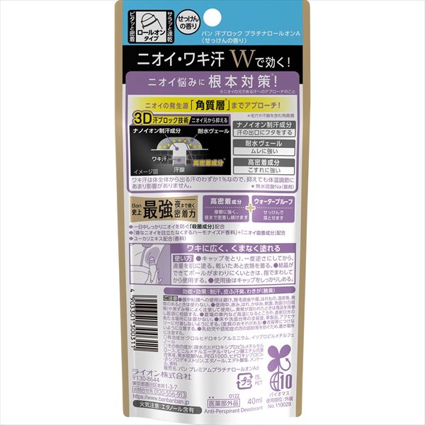 ワキ汗を抑えられるから夜まで汗ジミ・ニオイ気にせず過ごせるBan史上No.1密着力プラチナロールオン。1ナノイオン制汗成分が汗の出口にフタをして汗ジミやニオイの原因となるワキ汗を出る前にブロック。2高密着・ウォータープルーフ処方で、こすれ・ムレに強く、夜まで落ちにくい。3ニオイ菌の増殖を抑える殺菌成分に加え「ニオイ吸着成分+嫌なニオイを目立たなくするハーモナイズド香料」を新配合。4せっけんの香り。
