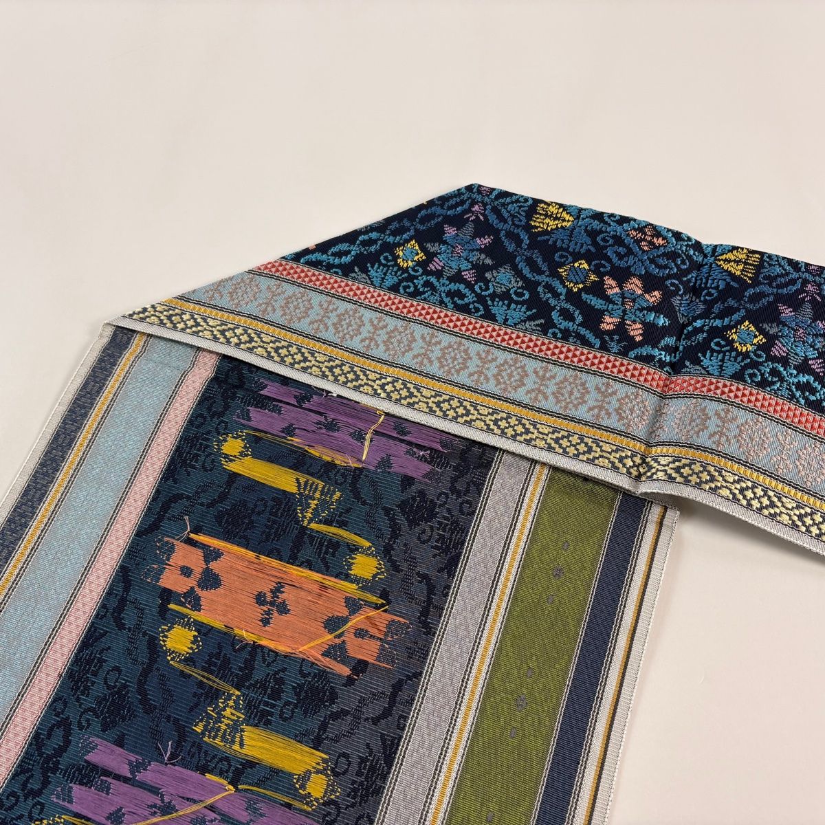 名古屋帯 八寸名古屋帯 松葉仕立て 縞 花唐草 紺色 正絹