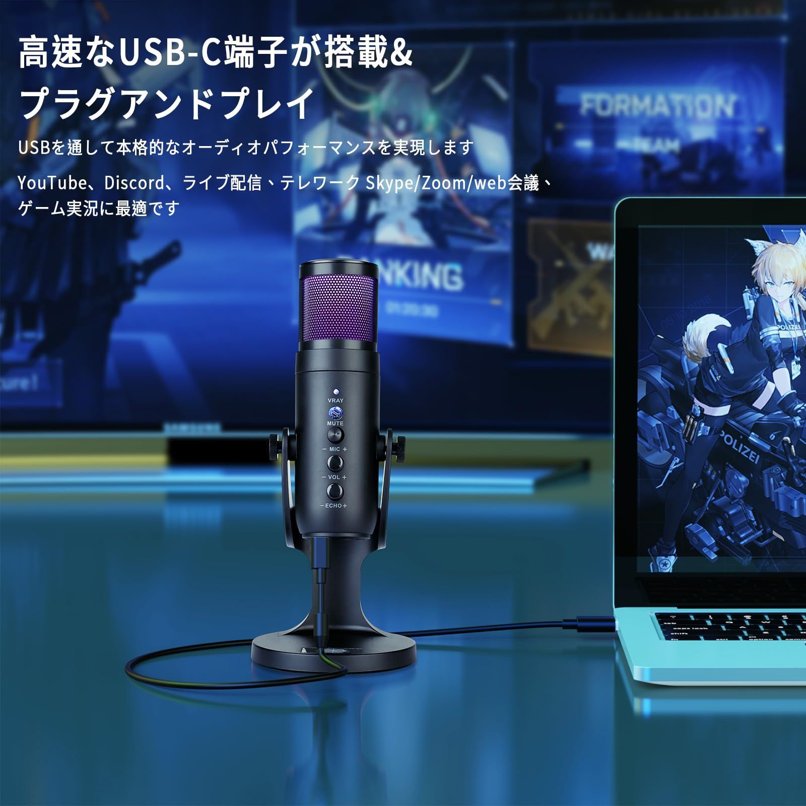 在庫 ライブ配信 ゲーム実況 PS 5 4使用 PC YouTube ワンタッチミュート カーディオイド指向性 Skype RGB光り マイク ゲーミングマイク web会議 ダビング 在宅勤務に適合 コンデンサーマイク USB Ca