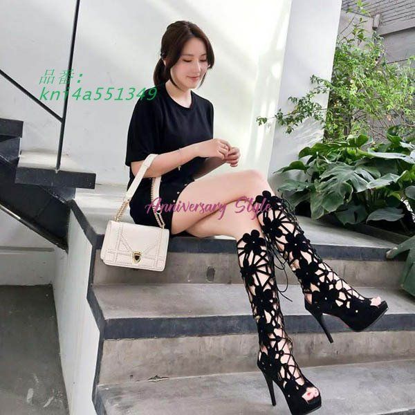 サマーブーツ レディース ロング ヒール 編み上げ 黒 ハイヒール パンチング 0631720 2025 38 花柄 24 CM 夏 レースアップ kni 4 a 551349