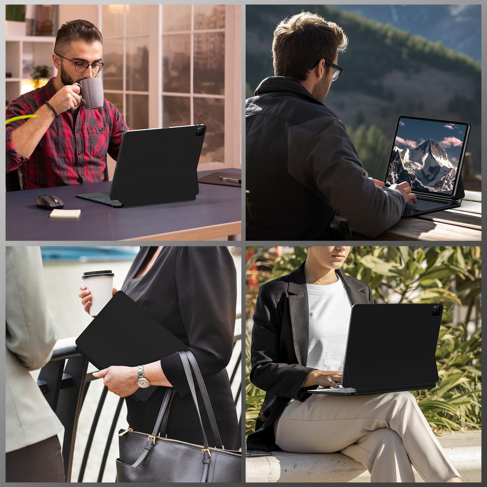【強力磁気設計&角度調整】マジックキーボードの背面カバーとiPadカメラ位置を合わせるだけで一秒間で磁気吸引、iPadをしっかりと固定することで、あらゆる場面でしっかりと保護することができます。ケースは強力な亜鉛合金ヒンジにより、iPadの重さでひっくり返らない位置まで自分の見やすい位置にスムーズに角度調整が行えます。
