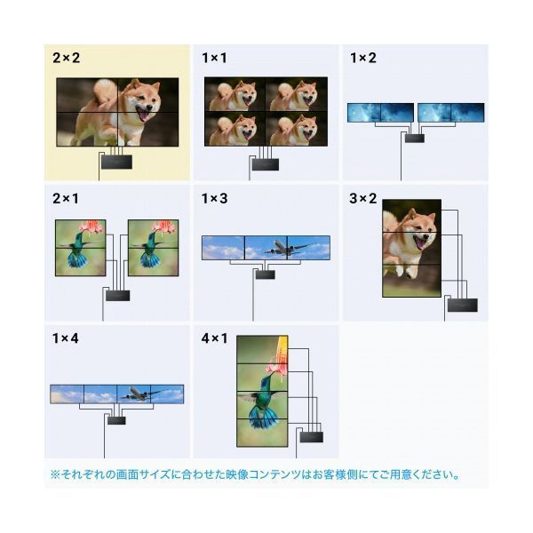 ●1つのHDMI映像を最大4台のディスプレイに分割表示し、大画面で表示することができるビデオウォールコントローラです。