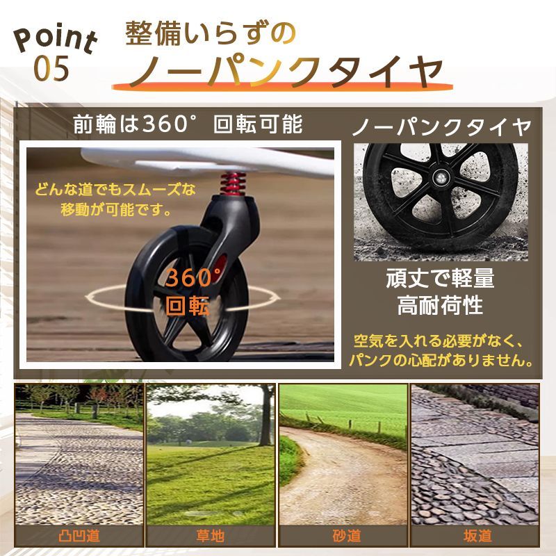 タイヤはノーパンクタイヤ設計で空気入れの手間もなく、パンクの心配もありません。