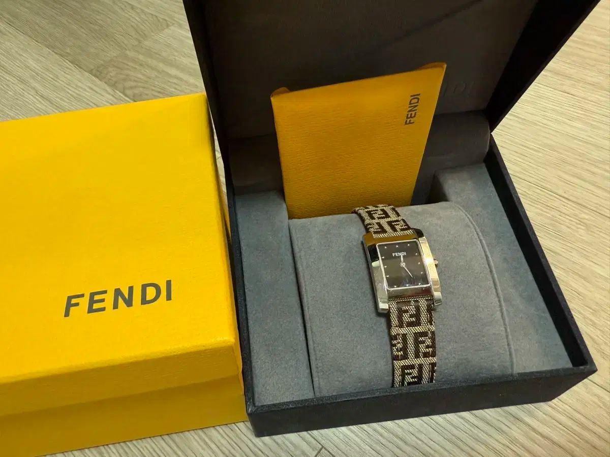 この時計は、フェンディブラウンのズッカ柄ストラップ、四角いシルバーケース、ブラックダイヤルが特徴です。