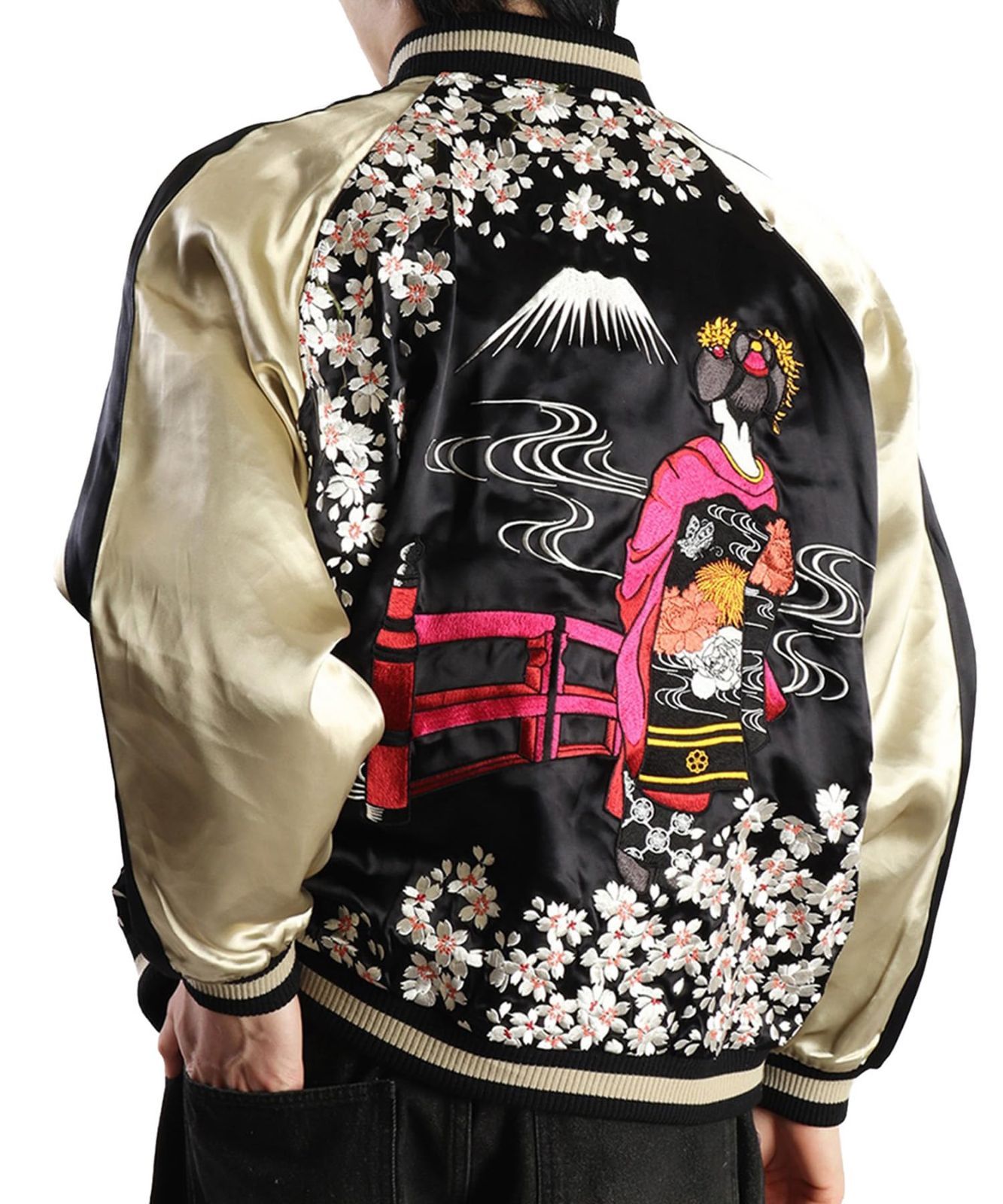 L RegularShort_01.ブラック×ベージュ HYAKKA RYOURAN 百花繚乱 和柄 総刺繍 リバーシブル スカジャン 舞妓 桜 富士山 太鼓橋 メンズ レディース MA-1 アウター ジャケット 無地 サテン 春 夏 秋 黒 0