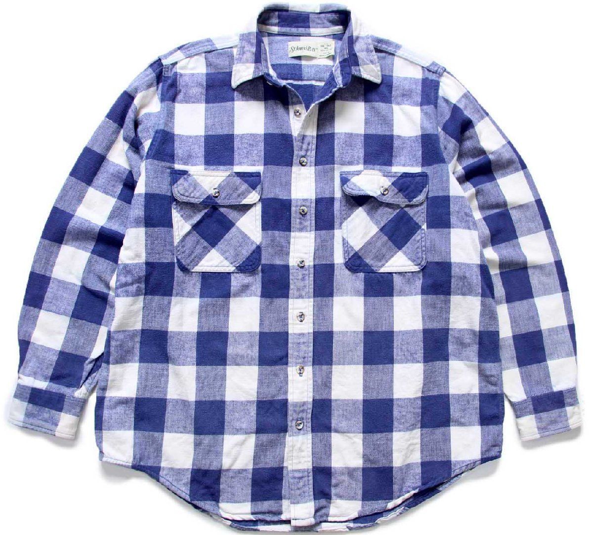 90 s STJOHN SBAY ブロックチェック コットン フランネルシャツ 薄紺×白 BIG TALL 1 XL バッファロー JCPenney ビッグサイズ