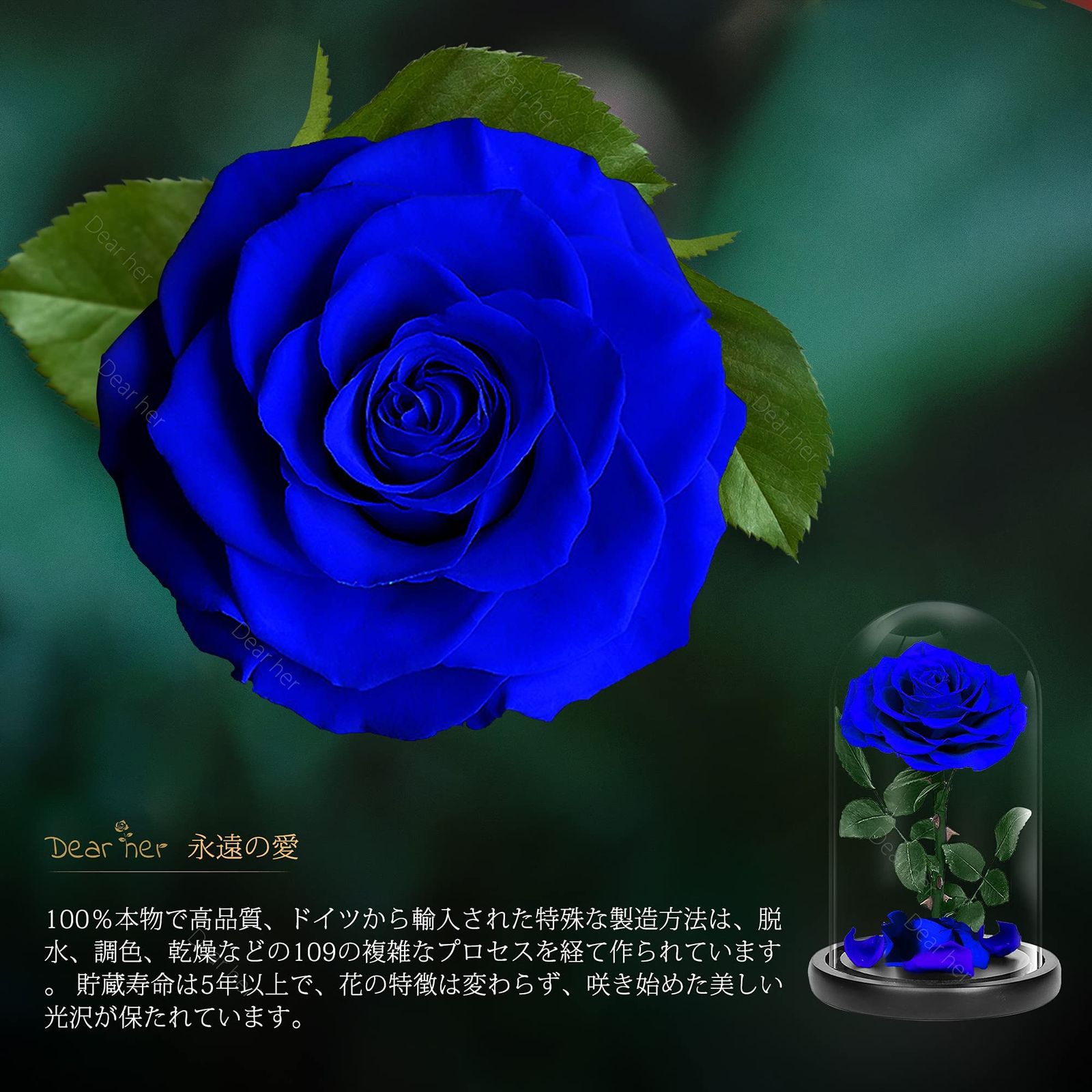 1.【本物のローズ】 - プリザーブドフラワーは造花とは違い、生花に特殊な加工を施しみずみずしさと美しさを長い時間楽しめるようにした枯れないお花です。新鮮なエクアドルのローズで手作りされ、本物のバラはより視覚的に楽しめます。ローズは真の愛を表し、永遠の愛を意味します。贈り物に最適です。