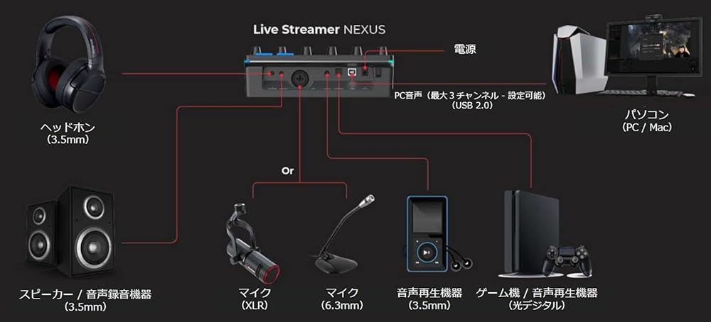 「商品状態」11「商品情報 (新品の場合) 」AVerMedia LIVE STREAMER NEXUS AX310はオーディオミキサー機能、配信ソフトウェアコントロール機能、配信プラットフォームの情報確認機能が一体となった配信者向けコントロールセンター。配信者の声、ゲーム音声、BGMといった様々な音声ソースのバランス調整、配信中のシーン切り替え、視聴者とのリアルタイムなやり取りなどが簡単に確認・実行できます。より高品質なエンターテインメント配信をお楽しみください。 「主な仕様」DV602 日本国内正規代理店製品 保証1年