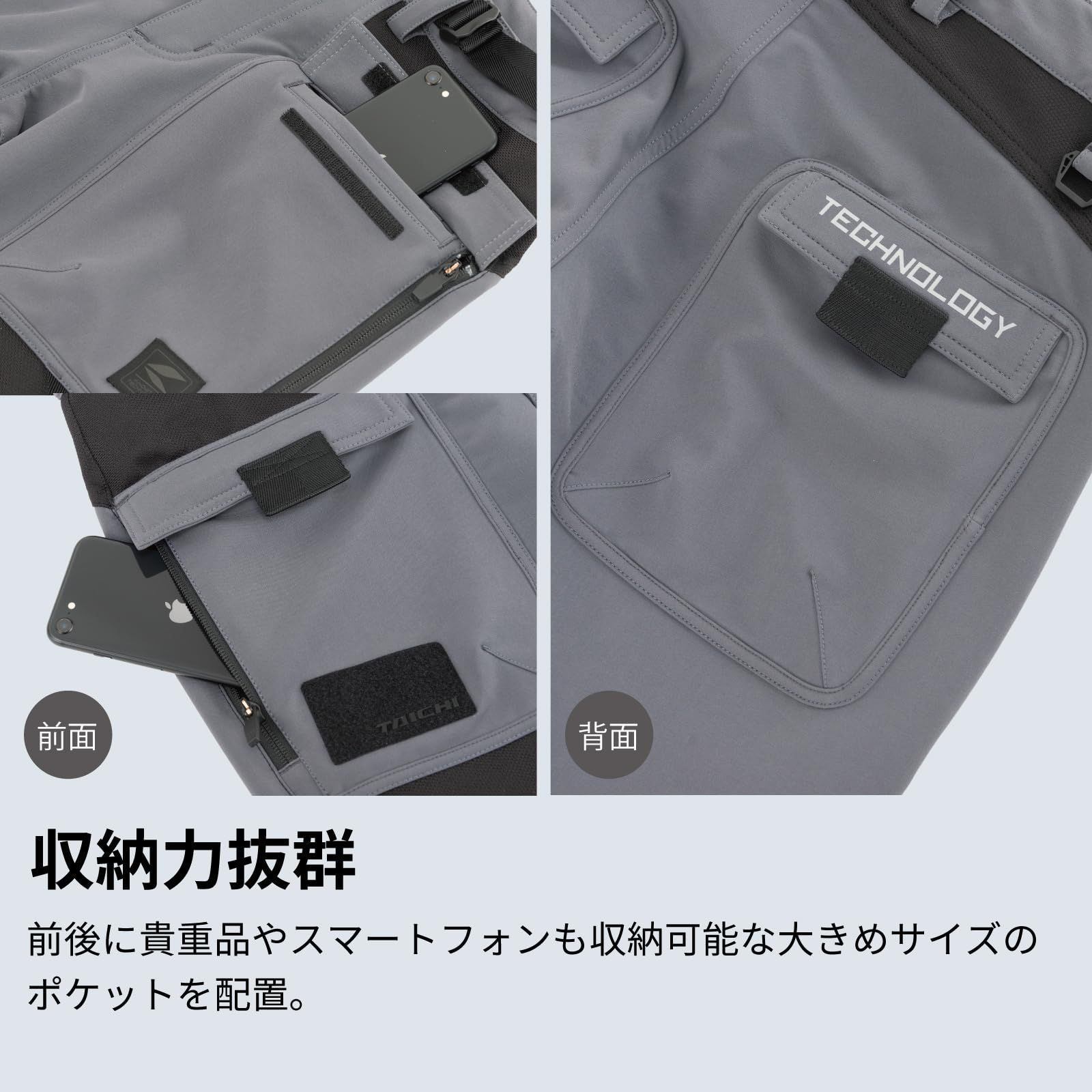 貴重品やスマートフォンなどが収納可能な大きめサイズのポケットを複数配置し、利便性も向上。フロントのポケット位置を少し下げることで中の荷物がライディング姿勢に干渉しにくい仕様になっています。