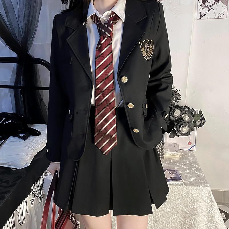 QOOLY ブレザー 黒 女子高生 コスプレ 制服 4点セット プリーツスカート ネクタイ シャツ 学生服 女の子 高校生 コスチューム 仮装 フォーマルスーツ 女子制服 卒業式 入学式 XL 0