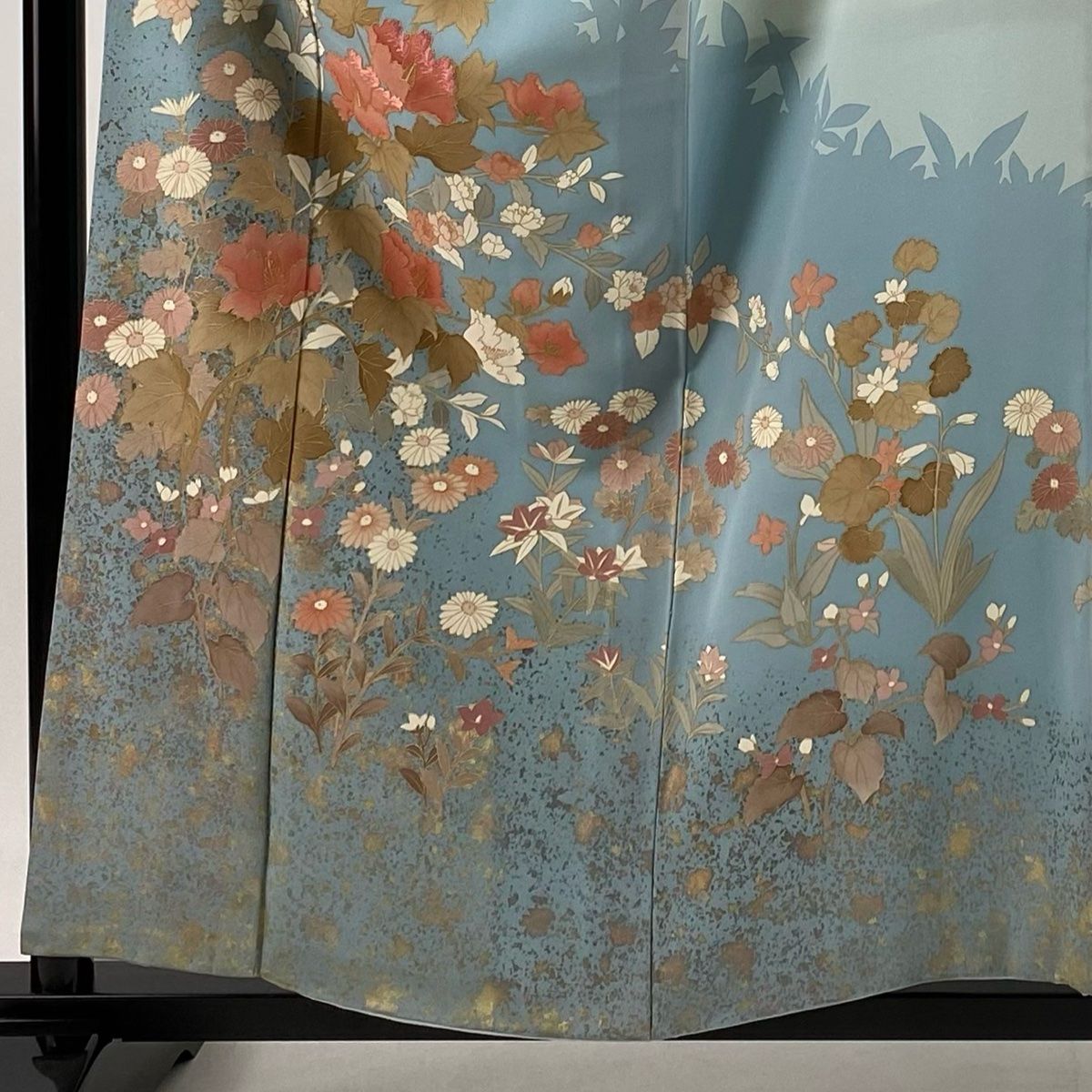 訪問着 身丈157.5 cm 裄丈67 M 袷 草花 シルエット 刺繍 金銀彩 水色 正絹 秀品