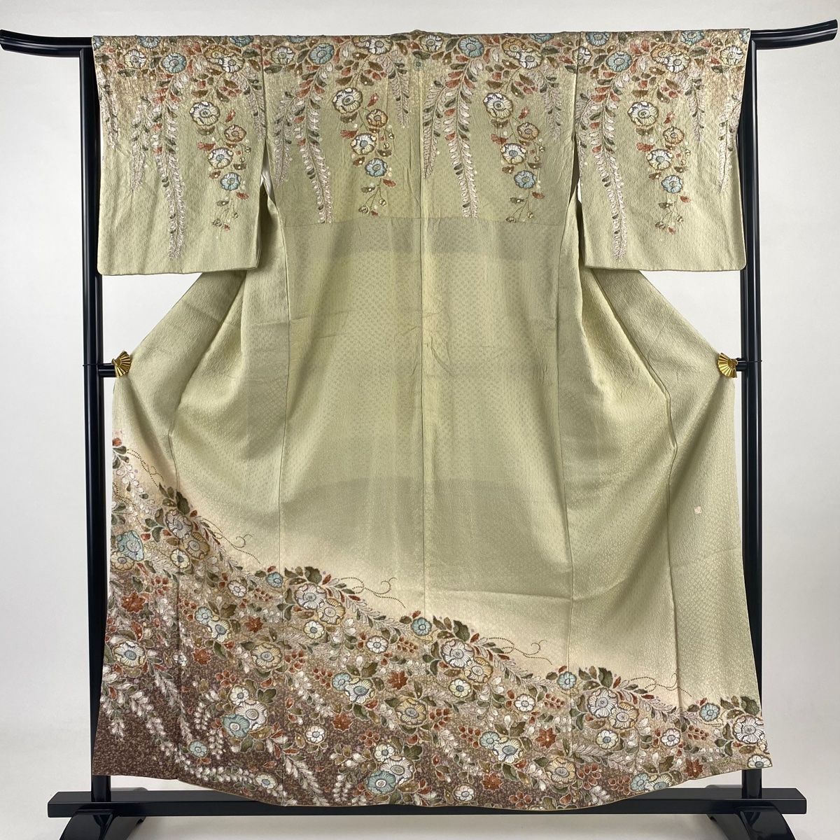 訪問着 身丈157 cm 裄丈64 M 袷 落款 辻が花 金彩 ぼかし 抹茶色 正絹 一つ紋