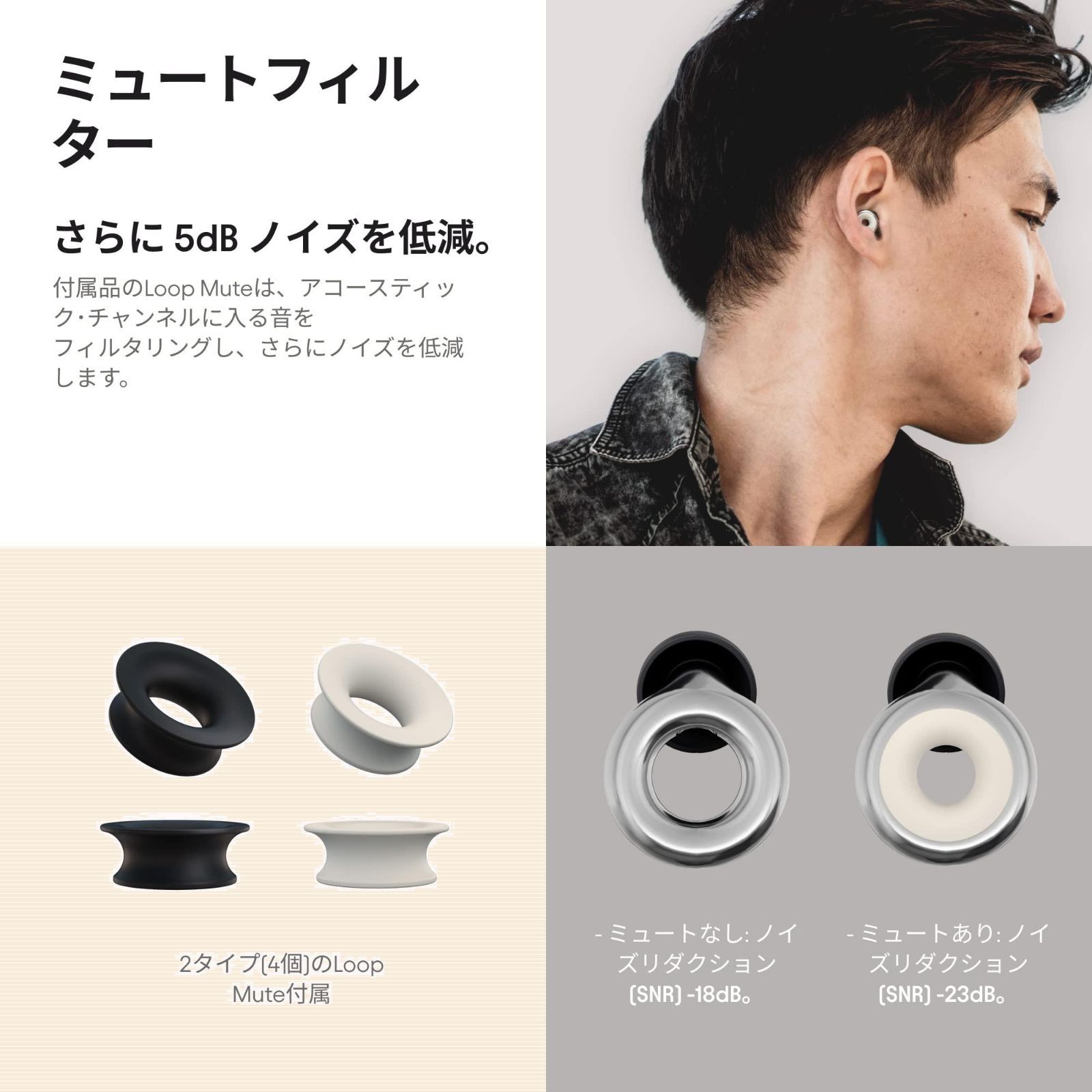 ノイズ低減 イヤプラグ Loop Experience Plusは、トップランクの耳栓として世界中で売られています。音質を保ちながらノイズを低減する、高忠実度のノイズ リダクション耳栓です。シリコンフィルター Loop Muteの着脱によって、ノイズ低減レベル (18dB / 23dB)を選べます。スタイリッシュなメタリック仕上げ、4色バリエーション。