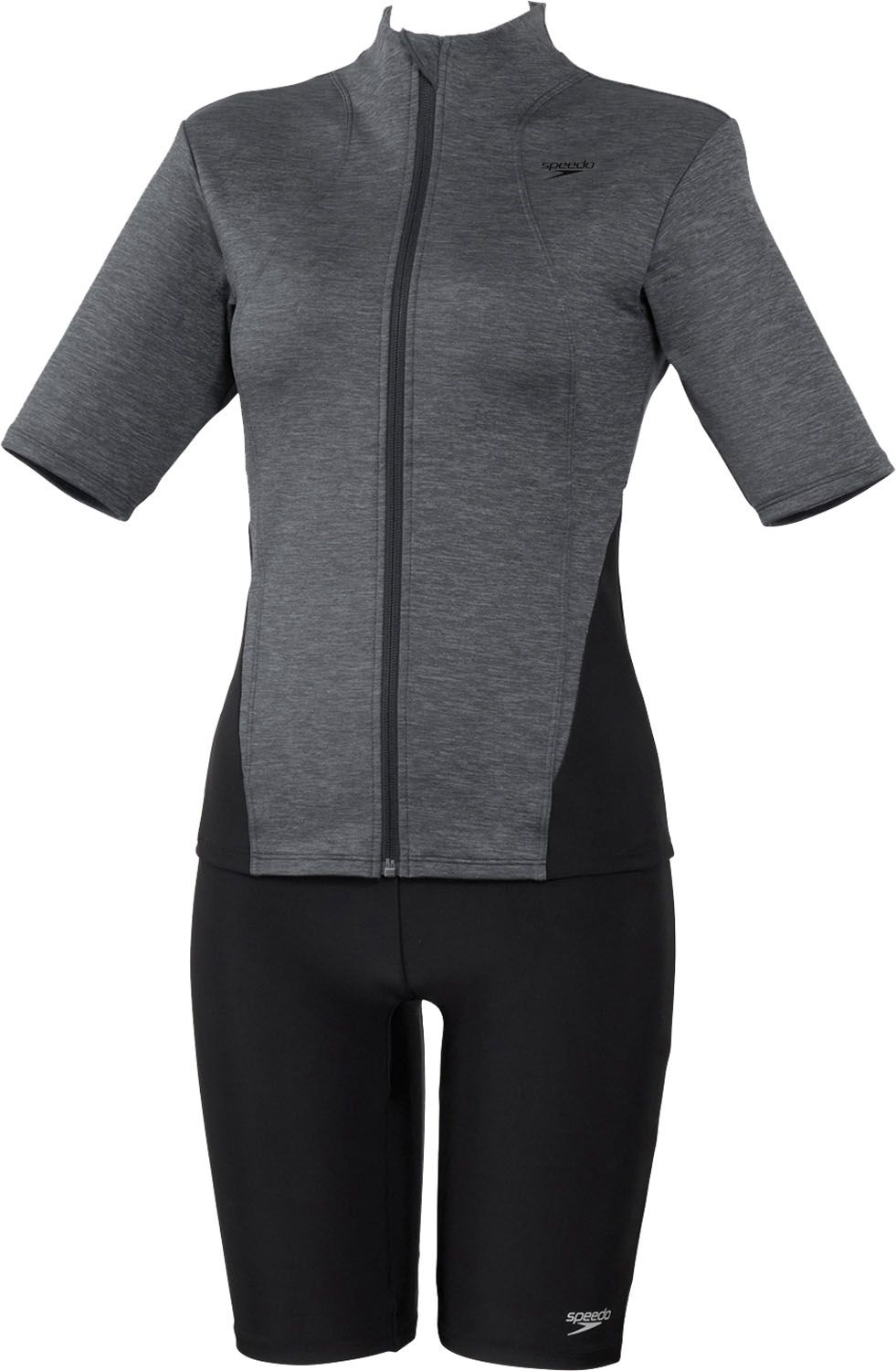 フィットネススイムウエアカテゴリー[ POOL ATHLETICS( プール・アスレティクス ) ]より、水中でのアクティビティを楽しむ方やはじめてプールでエクササイズを始める方におすすめのセパレートシリーズ。気になるパーツをスマートにカバーするレディースセパレーツ。トップスはソフトなストレッチ性とボディラインを拾いすぎないハリ感、軽量感が特徴の環境配慮型素材[ HEATHER STRETCH PRO( ヘザー・ストレッチ・プロ ) ]を採用。半袖タイプで気になる二の腕をカバー。フロントのウェービーライン & スタンドカラーにより、肩まわりはすっきりコンパクトな印象です。ウエストから裾にかけての切り替えデザインがウエストの位置を高くし、脚を長く見せます。背面中央の