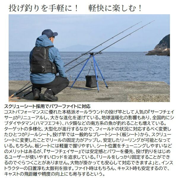 本格的な投げ釣りをもっと手軽に、軽快に。ブランクスにはロッドのネジレを防ぐ強化構造「ハイパワーX」を採用し、正確なキャストを実現。リールシートにはリールをがっちりと締め込み、リーリングおよびパワーファイトが安定するスクリューシート。トータルガイドホールドシステムはキャスト時のガイドの回転を防止。また、より軽快な使用感を求めて、リールシート長を再考。それらにより、キャストだけでなく、ファイト時の取り回しの良さも向上。堤防、サーフだけではなく磯などあらゆるシーンへの対応力が向上し、ビギナーから上級者まであらゆる投げ釣りで活躍。■30-425T・・・幅広いシーンに活躍するオールラウンダー。(参考対象魚・釣種)カレイ・アイナメ・マダイなど