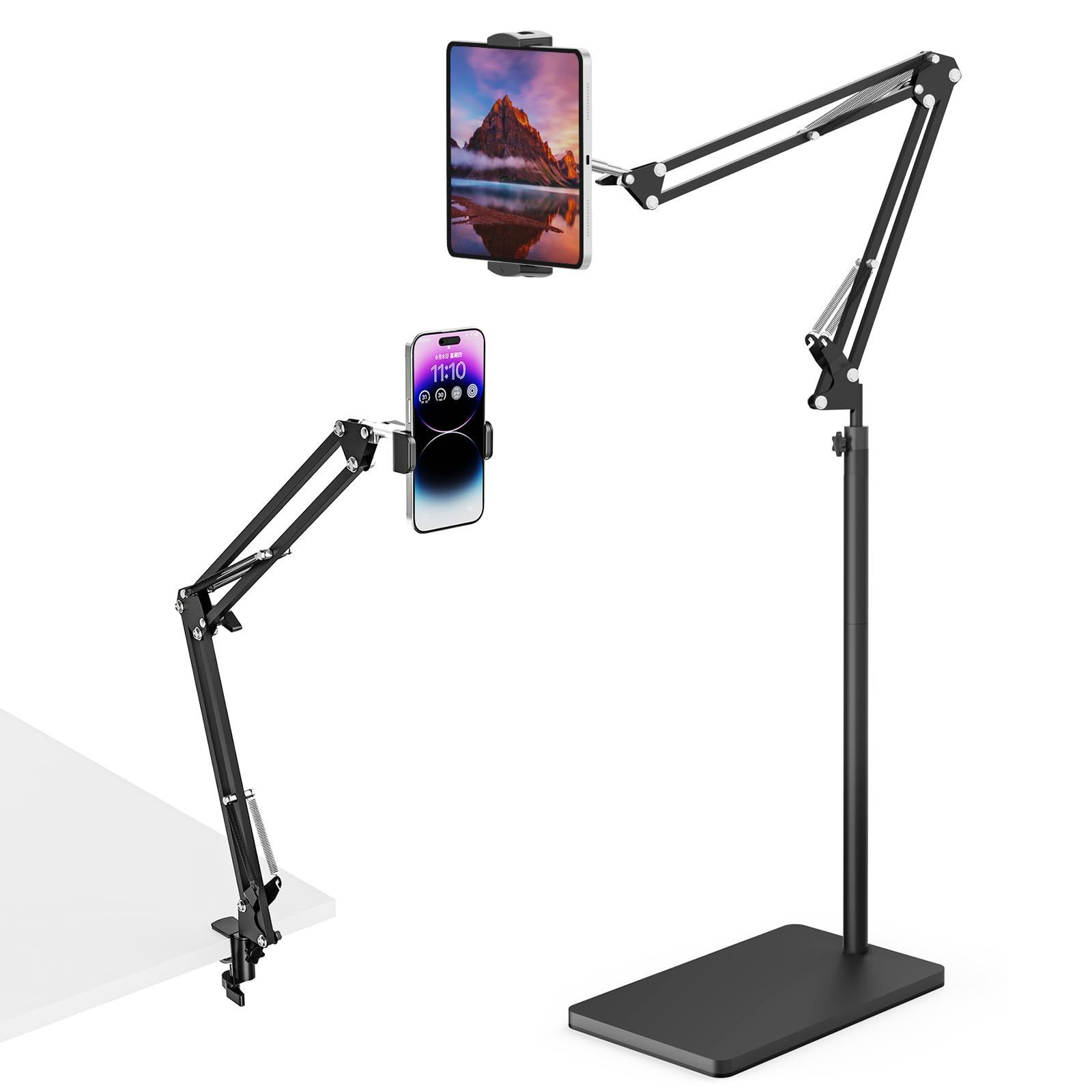 タブレットフロアスタンド、5kgの安定したベースとテーブルクランプを装備、高さ調節可能な伸縮アームは2つのスタンドを装備、iPhone、iPad Pro Air Mini、Galaxy Tab、Kindle、携帯電話(4.5~13インチ)に対応