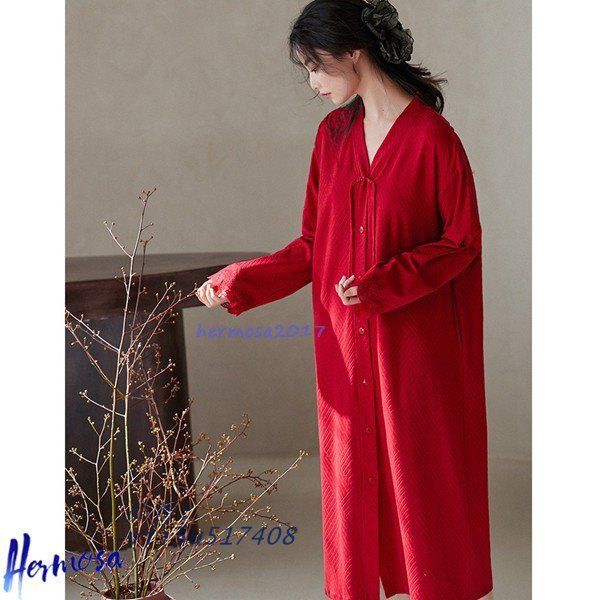 パジャマ ルームワンピース ネグリジェ レディース 春秋 長袖 通気 ロング丈 吸湿 コットン 肌触り バスローブ Vネック 薄手 綿 vii 5 u 517408