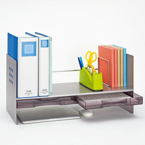 高級感のある丈夫なスチール製ブックスタンド。A4までの書類や小物の収納に便利な引き出しケース付き。ケース下の空間にはラップトップやタブレット端末の収納が可能です。間口65cm