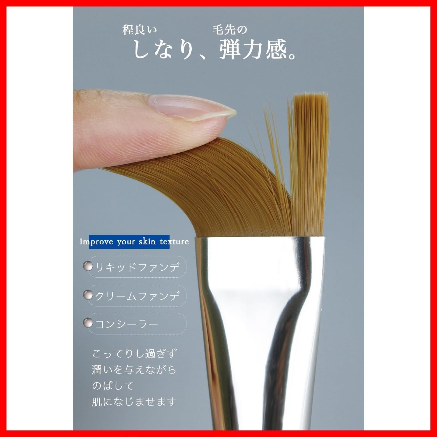 【肌の形状にフィットする平筆】柔らかく程よいコシのストレート毛。テクスチャーを広くのばしたり、細かい部分は筆の角を使うと鼻のキワや目の周り、眉毛の境などカバーできます。自由自在に肌の形状にフィットする万能化粧筆です。