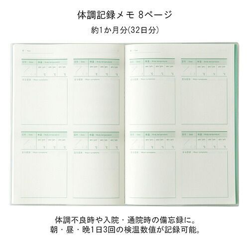 仕様サイズ週間検温表1年分、体調記録メモ32日分、フリーメモ、健康情報、ビニールカバー付/W150×H216×D5mm