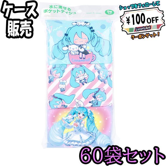 水に流せるポケットティシュ 初音ミク×シナモロール 16枚(8組)×9個入 ×60個のケース販売です