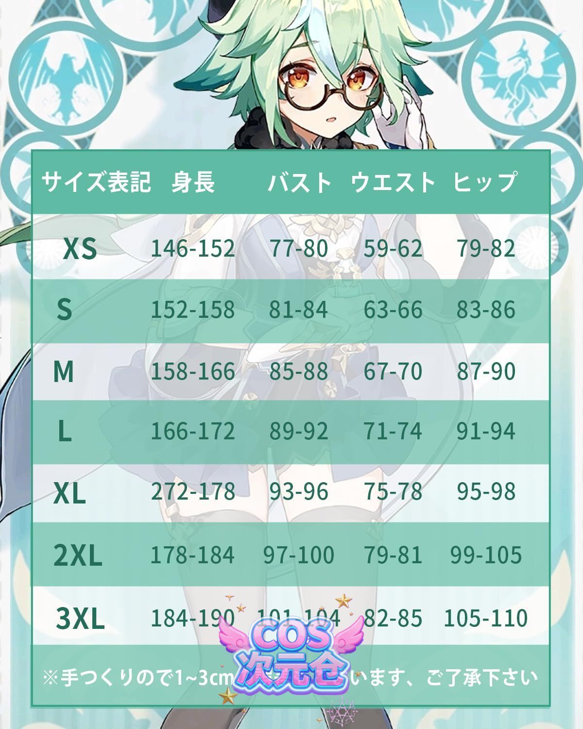 ※サイズ表はハンド測定のため、1~3cmの誤差は正常範囲内です。ご理解した上でご購入をお願い致します。