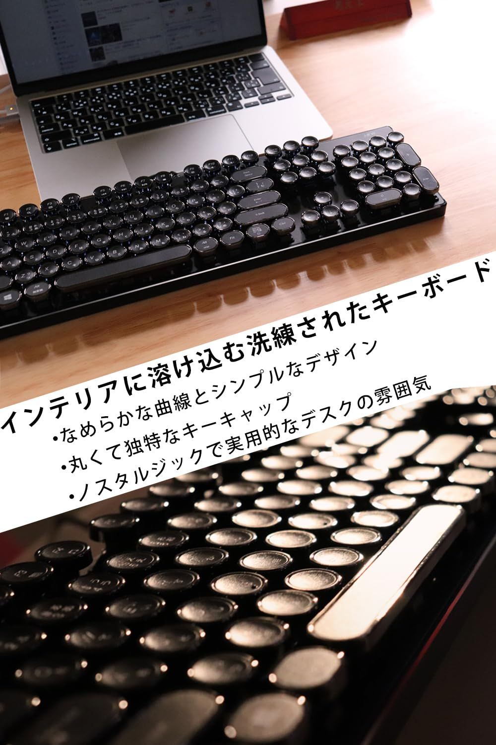 デザイン: アンティーク風。旧式のタイプライターを思わせるデザインが特徴で、ビンテージ好きやレトロなインテリアを好むユーザーに適しています。レトロなデザインで、おしゃれなオフィスやホームオフィスにぴったり。置いているだけでインテリアになる美しいキーボードです。
