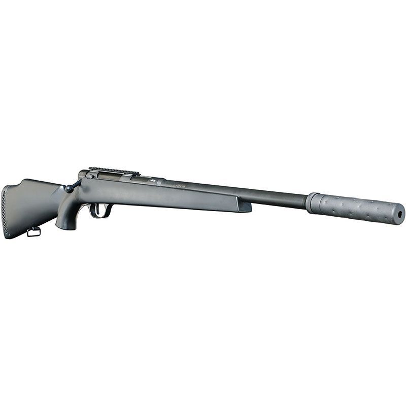装弾数25発のケースレス方式と装弾数5発のリアルなカートリッジ方式(薬莢使用)の2つのアクションが楽しめるボルトアクションエアライフルです。飛距離を伸ばす可変ホップアップ搭載しています。サイレンサーが標準装備されており脱着も可能です。