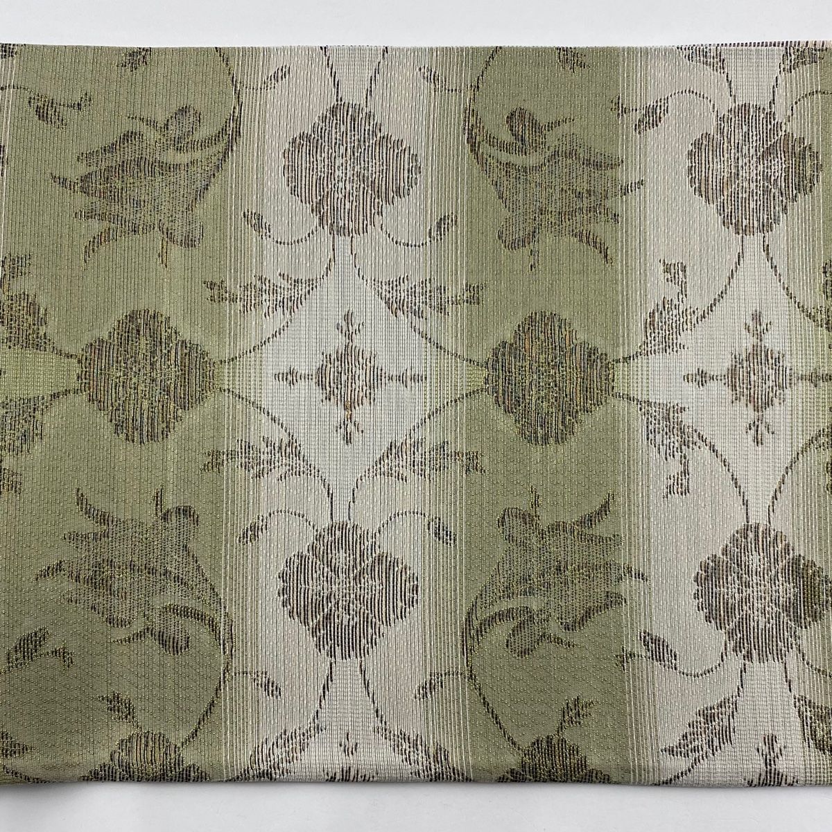 袋帯 秀品 花唐草 段縞 金糸 灰緑 六通 正絹