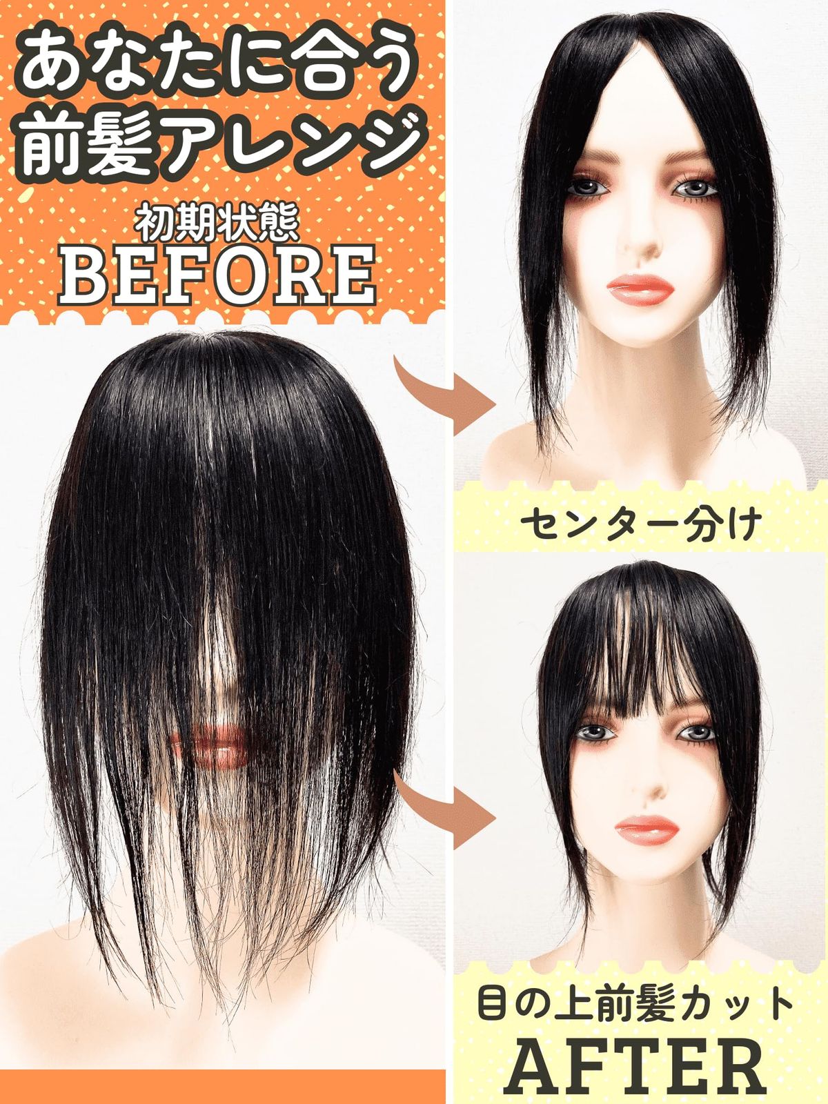 7前髪未カットの為、お客様のお好みの長さで前髪をカットし調整することが出来ます。またお洒落なセンター分けも◎✅【熟練の職人による総手植え】8特徴:【前髪未カット