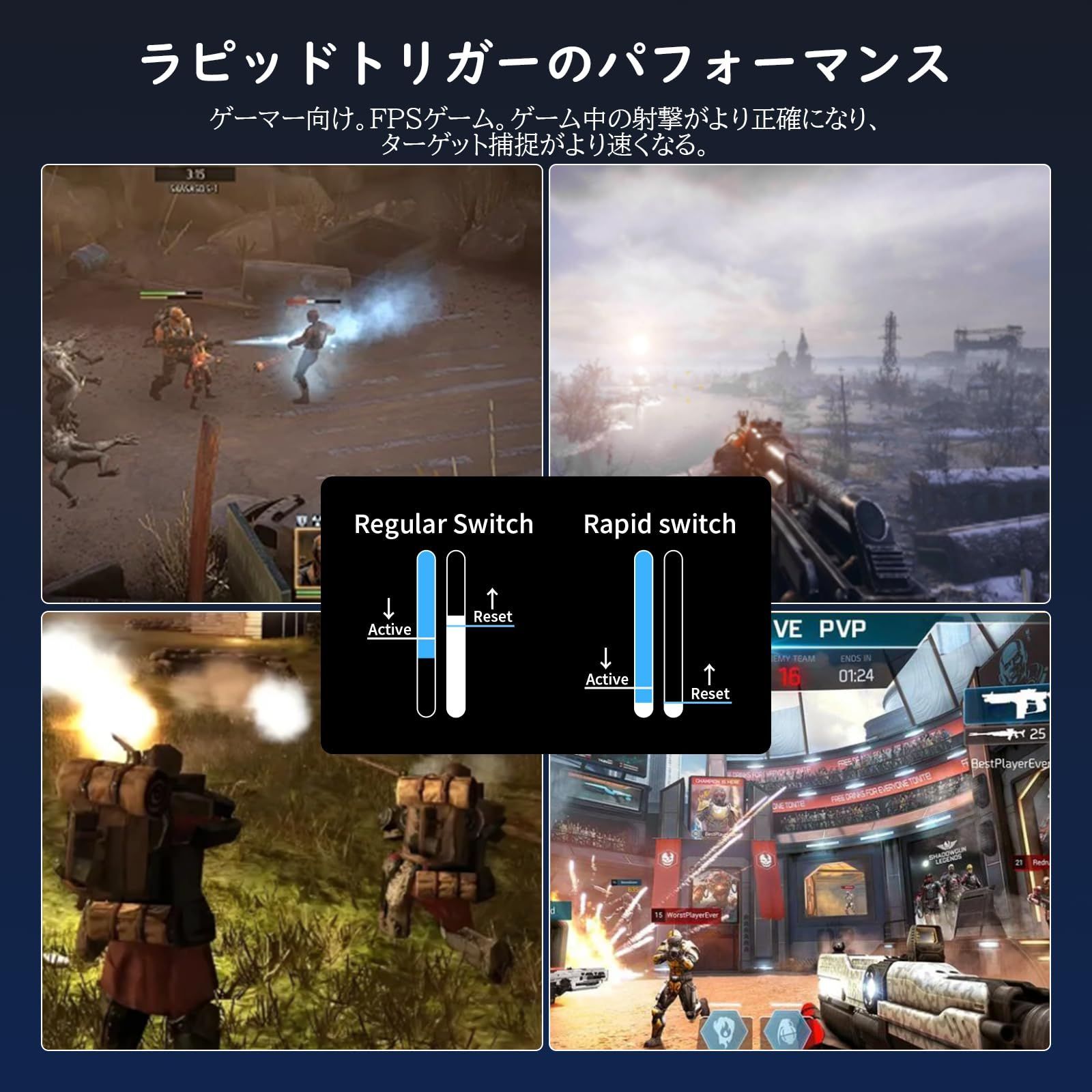 【0.01mm精度】新たにアップグレードされた、フルセグメント真の0.01mm精度、ダブル0デッドバンド。X68 HEマグネティック・シャフト・キーボードでは、各キーを0.01mmの精度で個別にカスタマイズでき、0.1mmから3.4mmのグローバル駆動範囲内で駆動ポイントを設定できるため、電光石火のゲーム・レスポンスや正確なキー入力が必要な場合でも、すべてをお好みに合わせてカスタマイズできます。キーが解除される前にキートラベルに戻る。クイック・トリガーは、作動と解除のポイントを動的に変更する。 キーは押されるとアクティブになり、離すと非アクティブになる。 キーは、固定されたリセット・ポイントまたはクイック・トリガー・ポイントを超えることなく、動作中に繰り返し押すことができる。