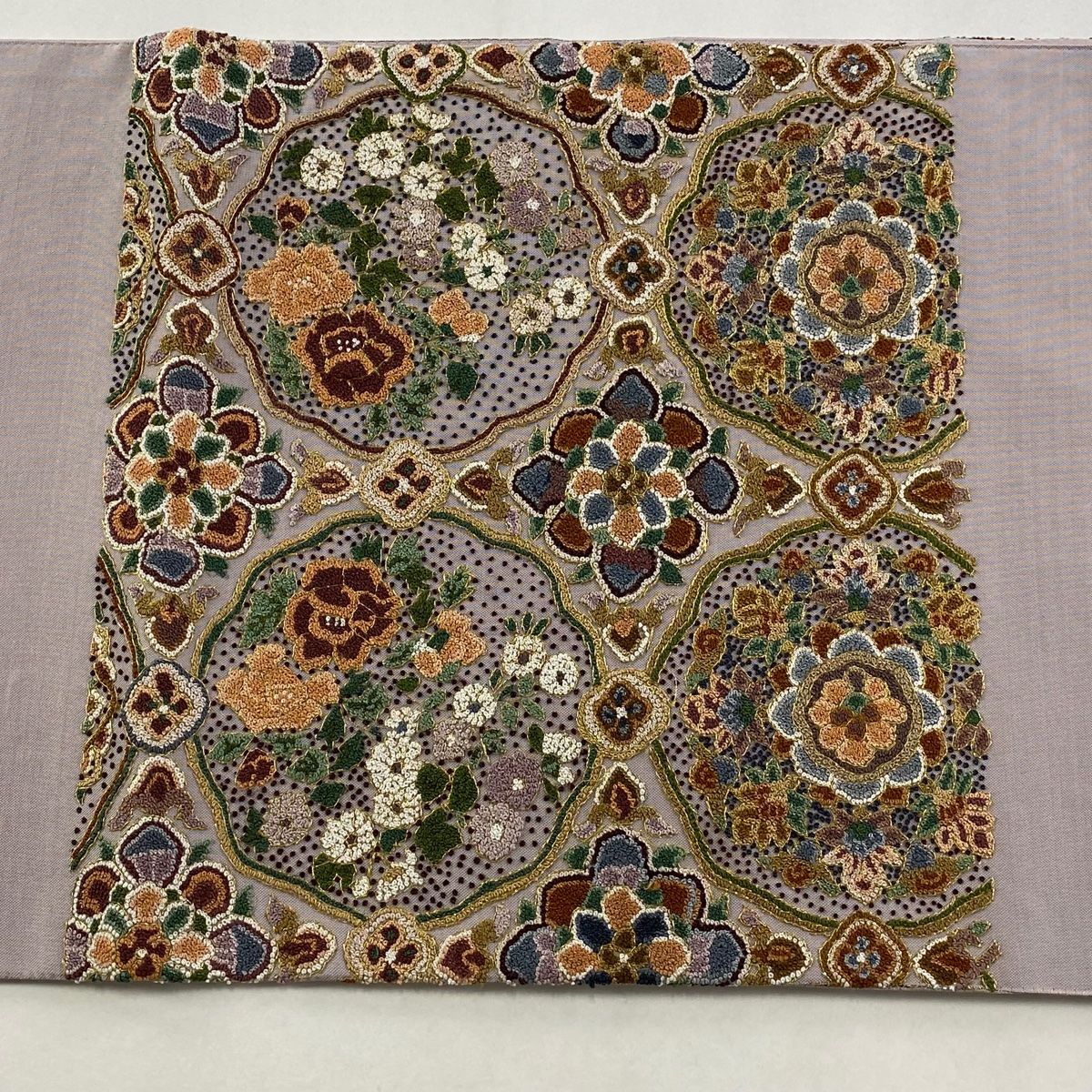 袋帯 華文 草花 金糸 相良刺繍 灰紫 お太鼓柄 正絹