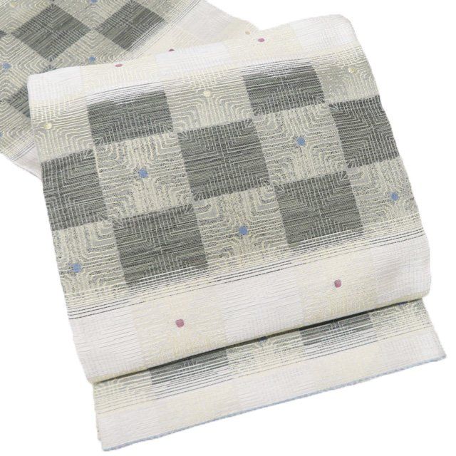 袋帯 正絹 セミフォーマル 仕立て上がり 六通 市松取り 金糸 オフホワイト 黒色 灰色 きもの北條 A 1278-15